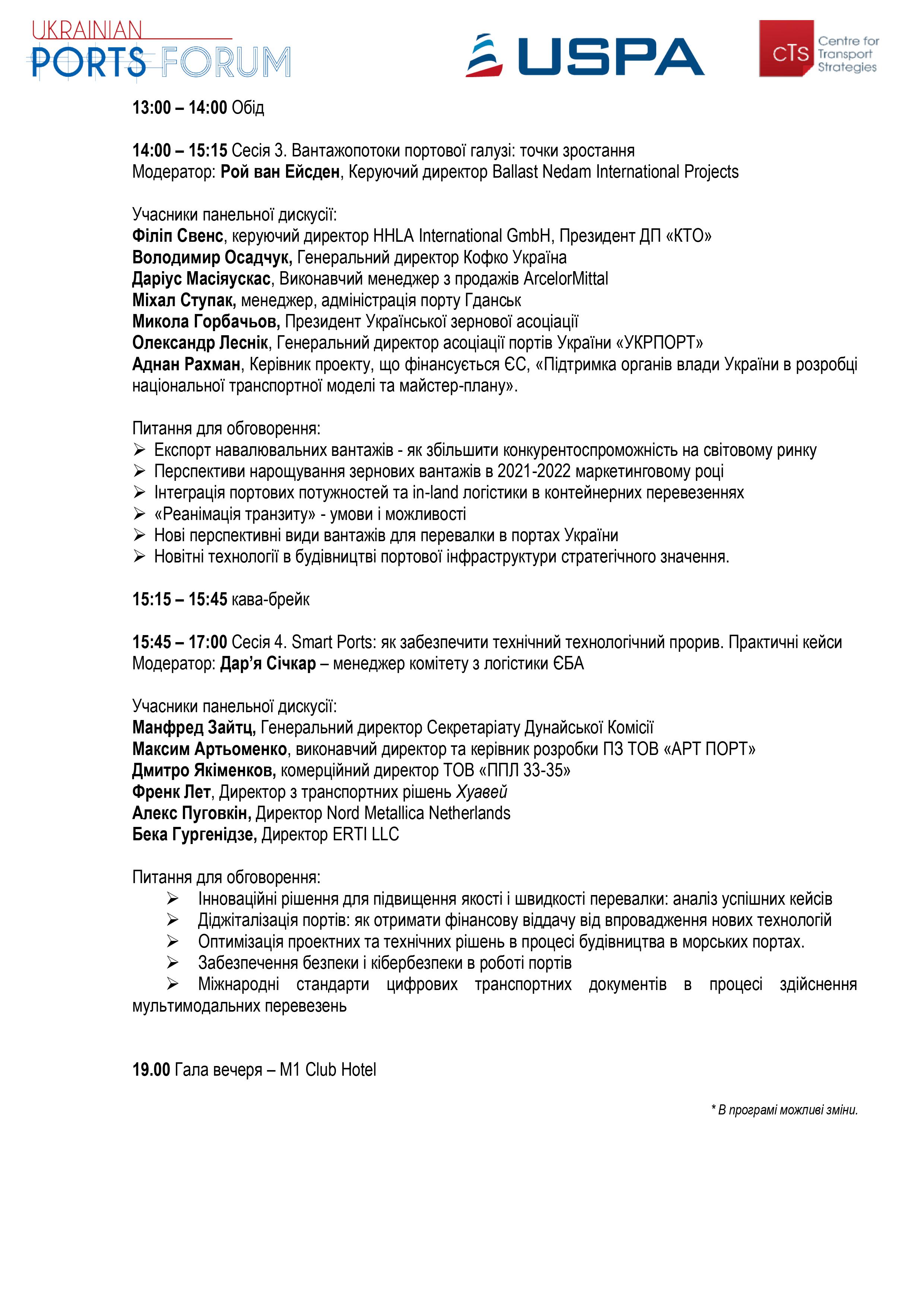Український портовий форум 2021 стане ефективним майданчиком для презентації ключових трендів, обговорення досягнень і бачення подальшого розвитку інфраструктури країни, в тому числі щодо інвестиційного потенціалу портової галузі України. Планів з реалізації проектів державно-приватного партнерства, діджіталізації процесів в портовій галузі та інше.В рамках панельних сесій і робочих дискусій будуть обговорені наступні питання :
