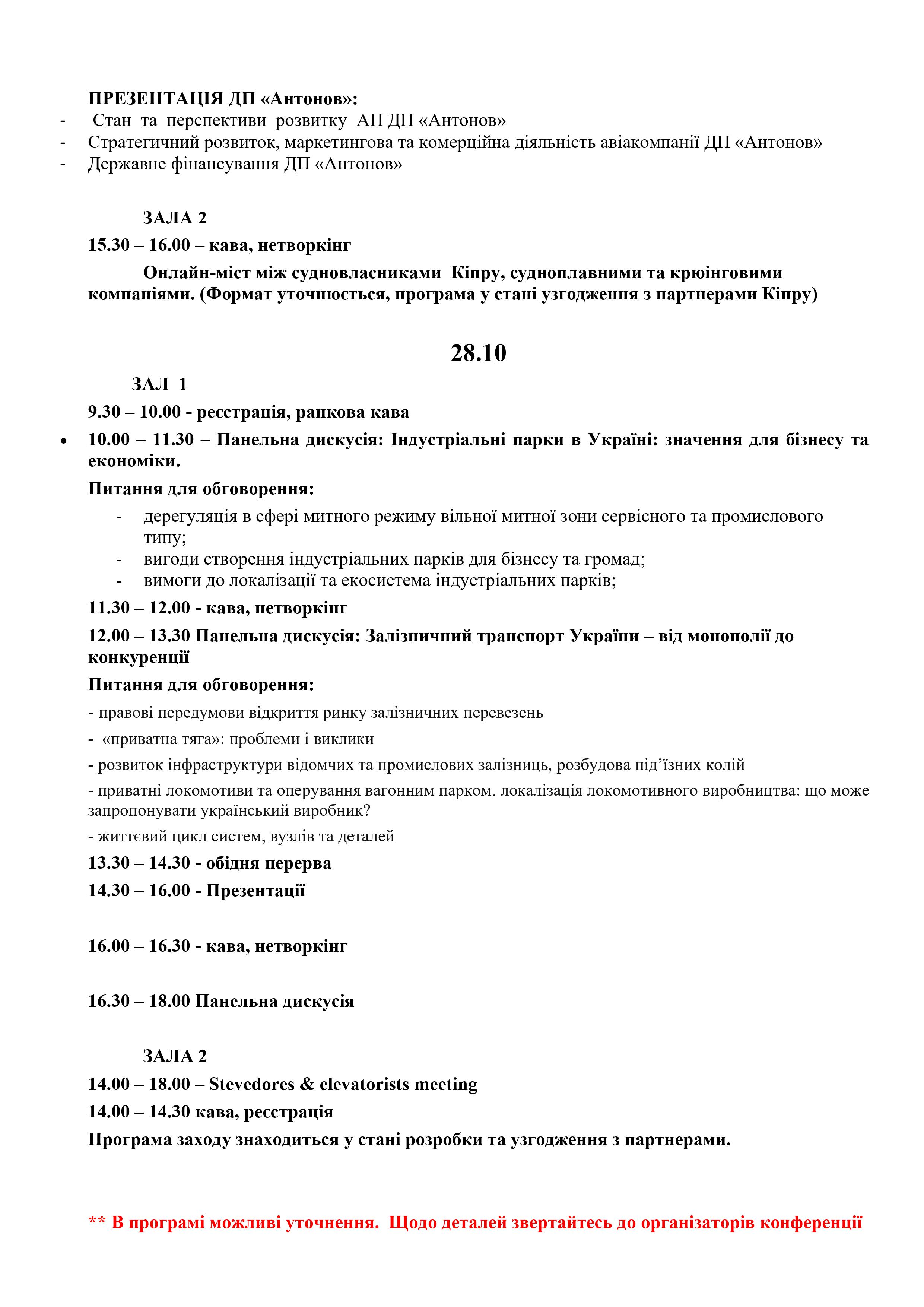 В рамках форуму відбудеться 17-а Міжнародна виставка з судноплавства, суднобудування і розвитку портів “Одеса 2020”, а також 23-я Міжнародна конференція “Розвиток транспортної системи України: виклики і перспективи. FOCUS: сухі порти, логістичні хаби, індустріальні парки, аеропорти”.