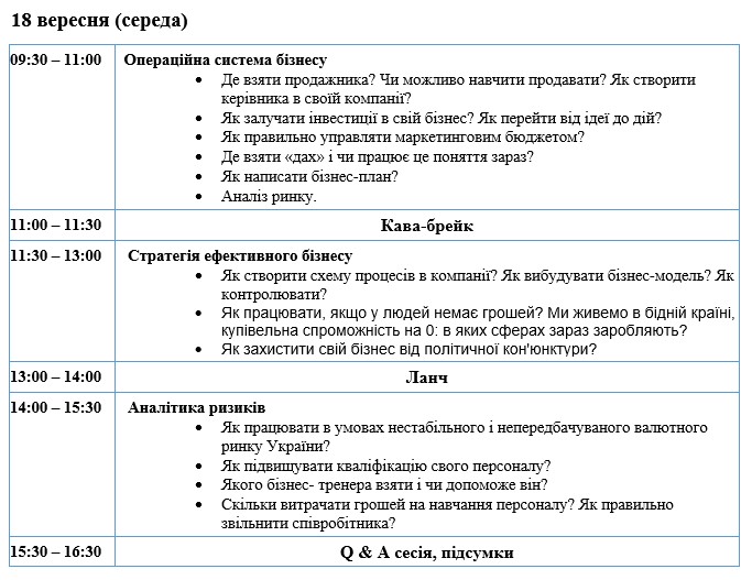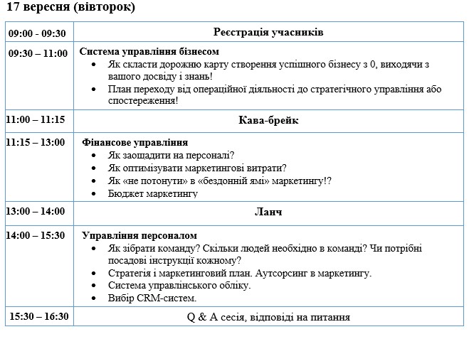 На заході ви вивчите принципи якісної роботи керівника та отримаєте набір практичних інструментів, які допоможуть вам підвищити особисту ефективність, налагодити бізнес-процеси та підвищити ефективність роботи персоналу.