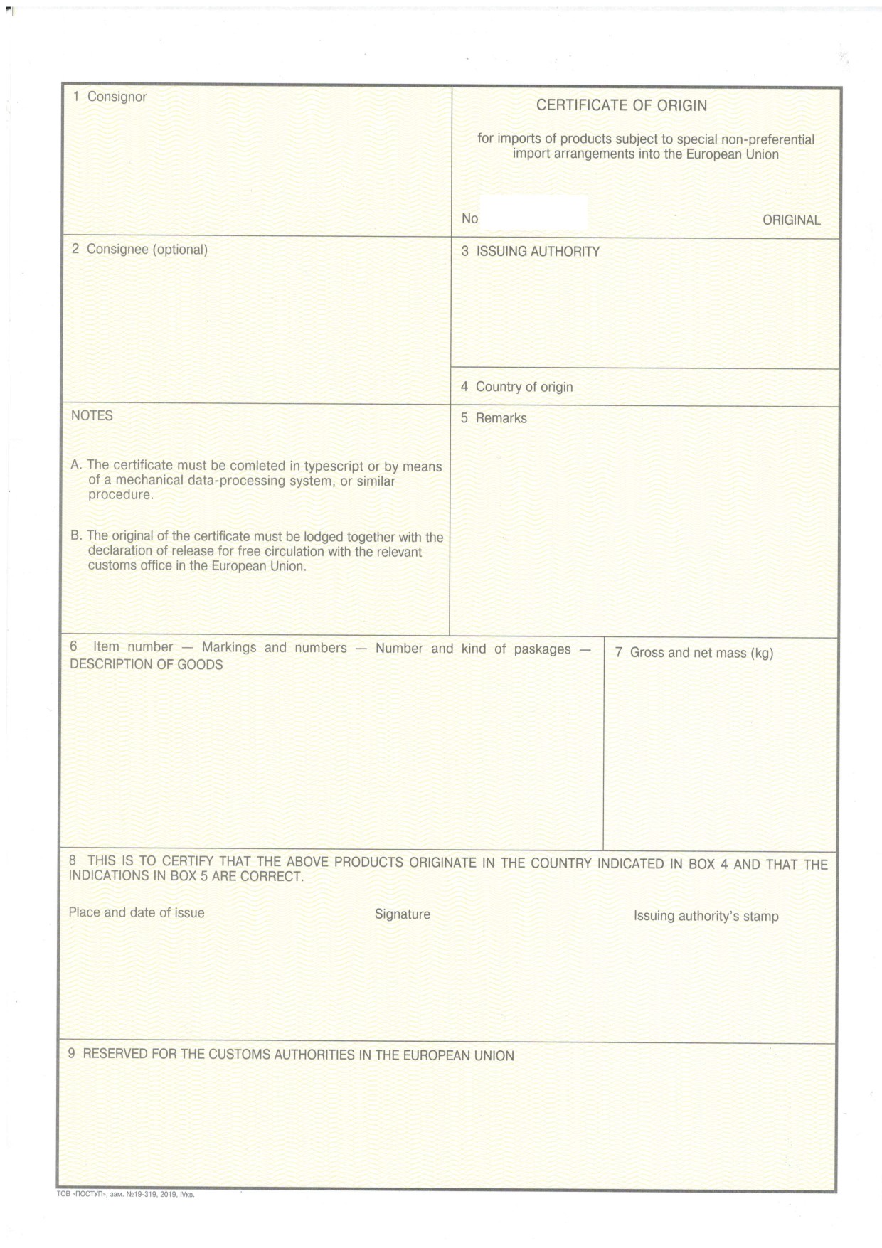 Сертифікати загальної форми спеціального зразку (англійською мовою) видаються (на пшеницю, ячмень, кукурудзу): на непреференційні товари, при експорті до країн ЄС і Сполученого Королівства Великої Британії і Північної Ірландії, до яких застосовуються тарифні квоти і до яких режим найбільшого сприяння буде застосовуватися після надання сертифікатів про походження загальної форми англійською мовою за зразком.