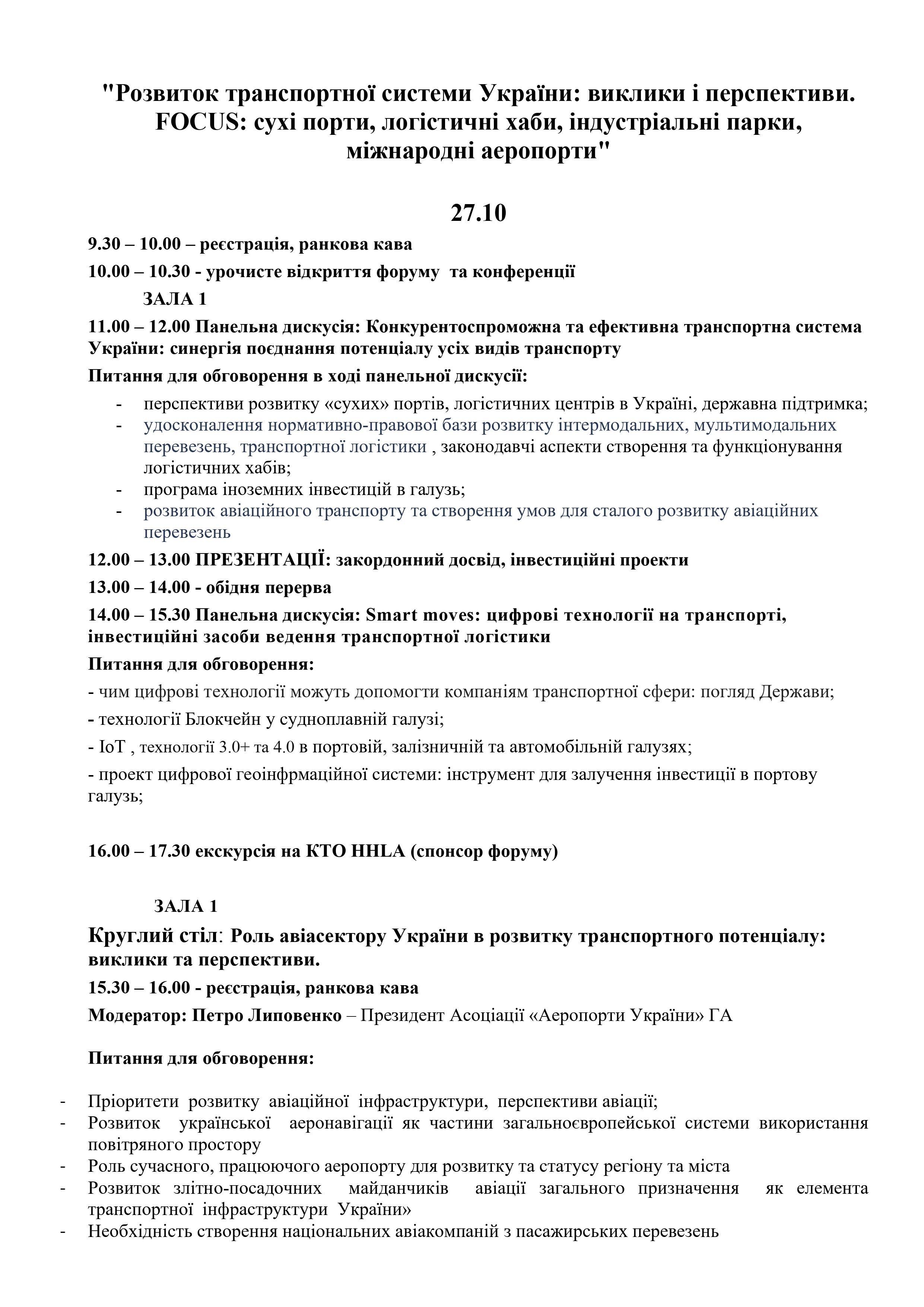 В рамках форуму відбудеться 17-а Міжнародна виставка з судноплавства, суднобудування і розвитку портів “Одеса 2020”, а також 23-я Міжнародна конференція “Розвиток транспортної системи України: виклики і перспективи. FOCUS: сухі порти, логістичні хаби, індустріальні парки, аеропорти”.